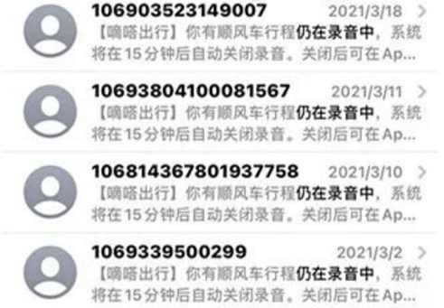 今年三月,杭州闻女士(化名)称使用嘀嗒出行的顺风车后,接连收到“程序仍在录音”的提醒短信。