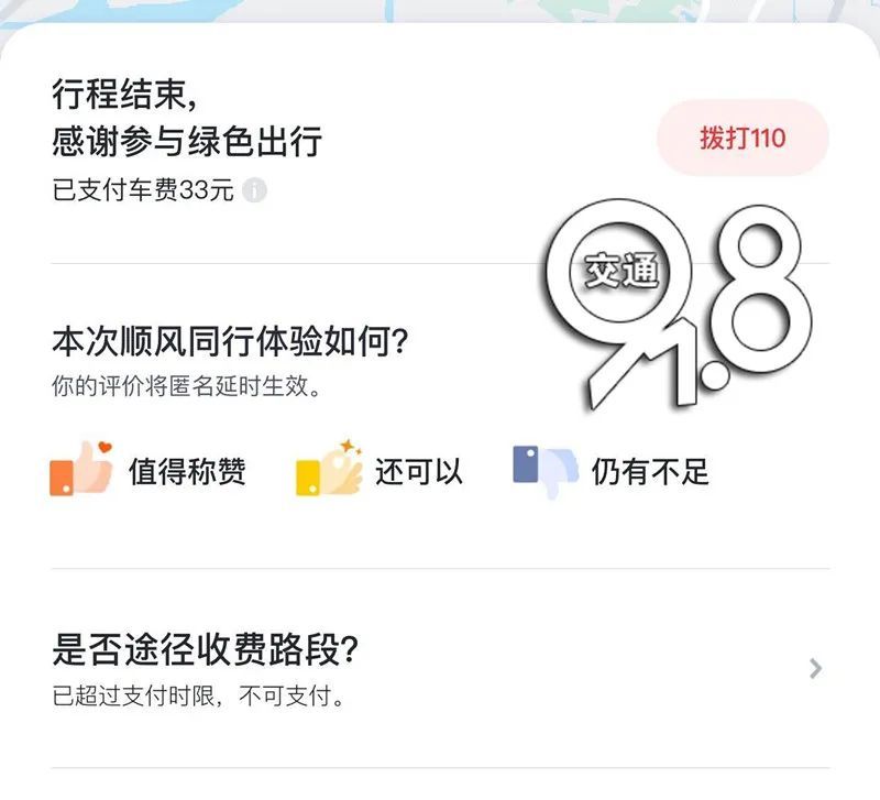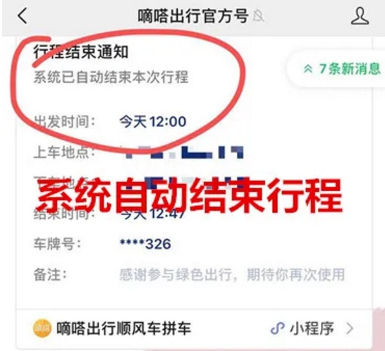 ▲行程结束后系统显示页面,并未出现需乘客手动点击的“确认下车”