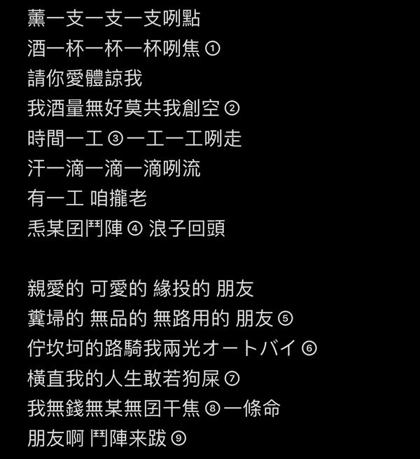 ⑨ 跋:赌博的意思。很多版本歌词写成 搏,看起来更励志,实际上是错的,搏 在闽南语里只有phok一个读音。还有的版本写成 博,取 博彩 的意思;但闽南语里 博 也只有phok一个读音,有 知识渊博和 大 两个意思。另外 跋 还有一个意思是求神问卜,是 跋桮 的缩略形式。桮 是 片状物 的意思,就是卜卦用的签,但经常写成同音的 杯 字。周杰伦方文山的伯乐之一、曾经的闽南语天后江蕙在2006发表了一张专辑叫《博杯》,还有同名主打歌,我以前一直以为是喝酒拼酒量之类的意思,但看歌词又不太对,直到找到了 跋桮 这个词才明白,这首歌说的是求神问卜祈求保佑亲朋好友平安顺遂的。