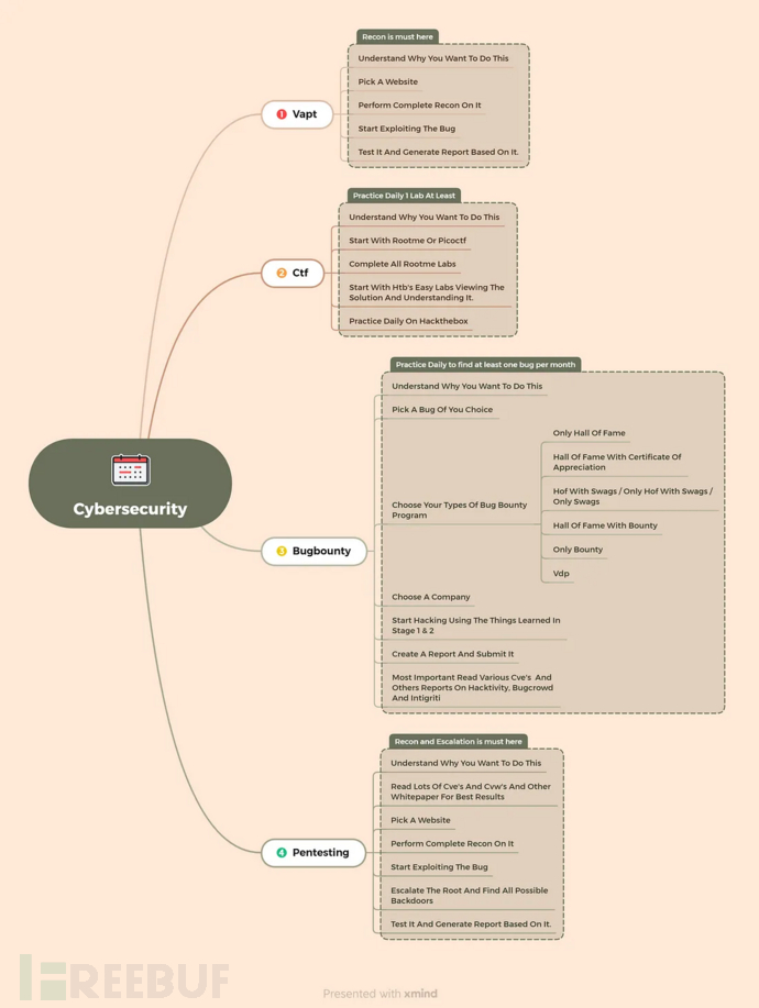 总之,虽然我最初从别人的成功中寻找灵感,但我了解到,拥有一个结构化和可管理的学习方法对于避免在浩瀚的信息和资源海洋中迷失方向至关重要。因此,在我经验分享的最后一部分,我将分享我学习VAPT/Pentesting/Bug Bounty的粗略结构和方法,其他人可能会觉得有帮助。