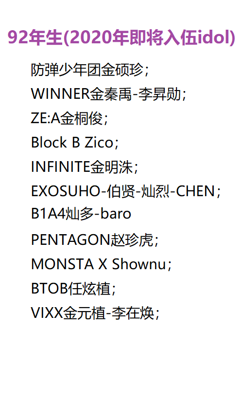 今年将入伍的92年生偶像包括防弹少年团金硕珍;WINNER金秦禹-李昇勋;ZE:A金桐俊;Block B Zico;INFINITE金明洙;EXOSUHO-伯贤-灿烈-CHEN;B1A4灿多-baro;PENTAGON赵珍虎;MONSTA X Shownu;BTOB任炫植;VIXX金元植-李在焕等