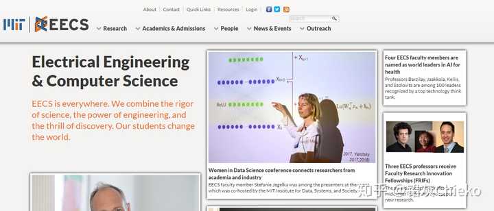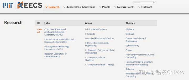 举个例子:比如我们想要看看MIT有哪些 Computer Science 有关的lab,每个lab是做什么方向的。首先我们搜索 【MIT Computer Science】 ,然后进入了MIT的Electrical Engineering & Computer Science部门页面。
