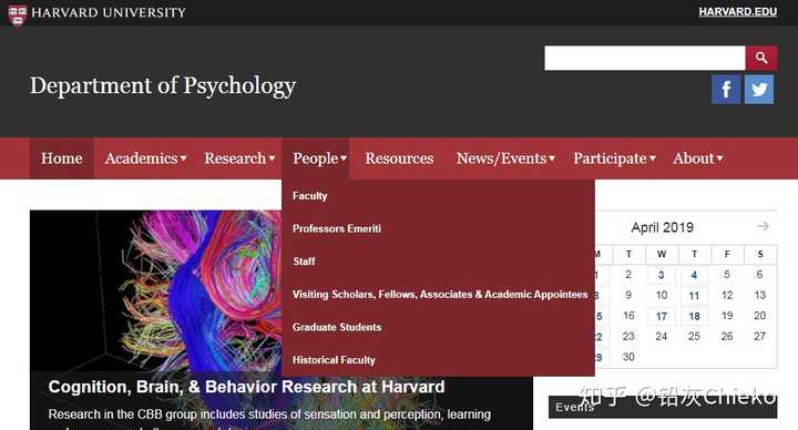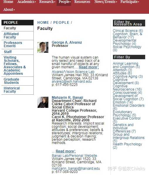 以哈佛大学的心理学部门为例:首先搜索【 Harvard Psychology 】,找到哈佛大学的心理学部门Department of Psychology。接下来点击 【People-Faculty】 选项,进入查看部门下面的所有教员。
