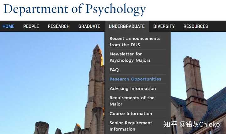 如果你目前还没有十分心仪的教授,只是单纯想看看这个学校有没有暑期科研的机会,那么我们可以在google或百度直接搜索 【大学名字 专业/院系名字】 ,就可以找到这所大学某部门的网站。例如搜索 【Yale Psychology】 ,我们就能够以迅雷不及掩耳盗铃之势在下面找到耶鲁大学心理学部门的网站。