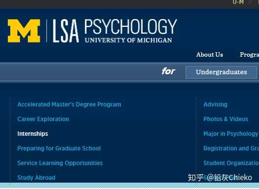 再举个栗子,如果我们想看看密歇根大学心理学的科研机会,可以搜索【University of Michigan Psychology】,接下来大概率我们就会看到它的心理学部门网站了。同理,找到页面中的【Undergraduate】,看到下面有【Internships】,我的内心充满了信息时代独有的快乐。