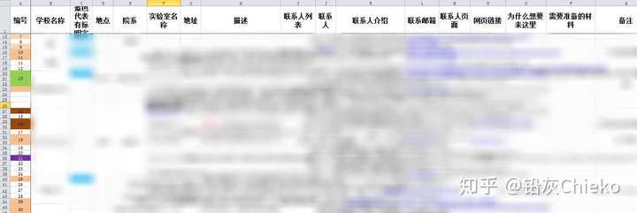 最后是需要一个 记录自己发邮件情况的excel表格 。为什么需要这样一个表格呢?因为海投量很大,海投时长从12月开始到4月持续好几个月,这时候可千万不要相信自己的记忆。最好用一个表格记一下自己心仪的实验室,给投过的实验室做标记,以免发漏,之后第二遍追加投的时候也可以做标记,下面是我暑期科研的时候用来记录申请情况的一个excel表格,就包含了各种需要的信息,用颜色表明自己投过与否以及投了几遍。这个表格建议大家根据自己的情况设计。