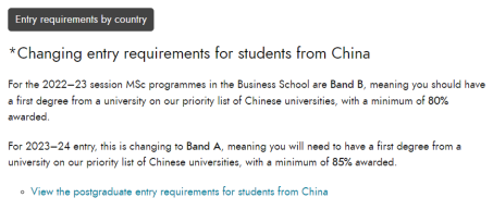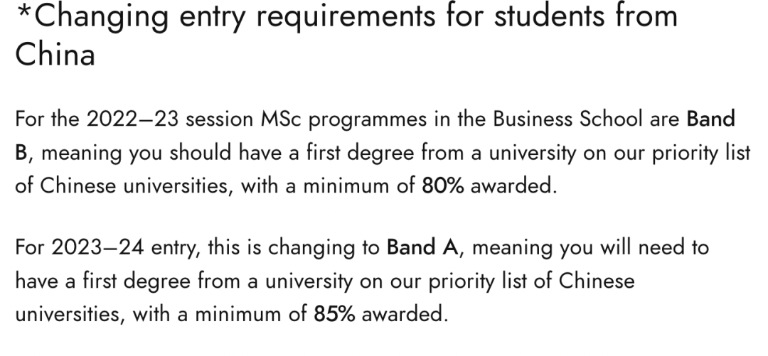 在2022申请中,爱丁堡大学破天荒发布了中国大学认可LIST,而今年,学校更是把商学院13个专业提升了等级, 在原来19个band B的专业中选出13个专业(商学院除MBA外的所有专业)提升为band A ,这就意味着这13个专业的入学要求也会随之“水涨船高”,申请难度升级!