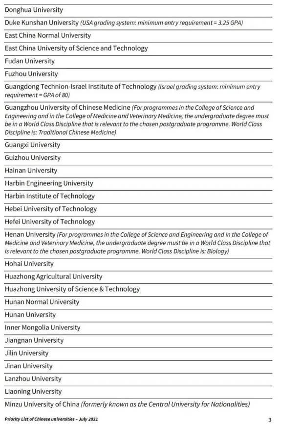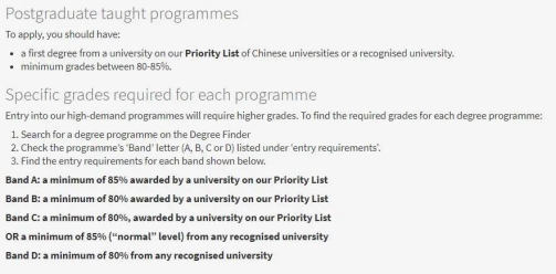 Band C: 优先名单上的大学,要求均分80%以上,以及其他受认可大学,均分85%以上