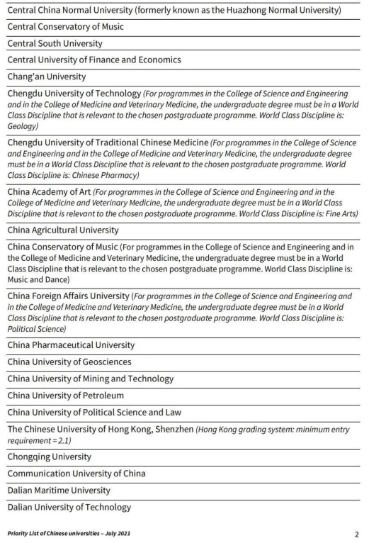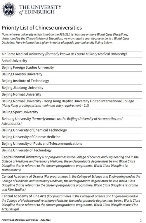 爱丁堡大学中国大学优先名单