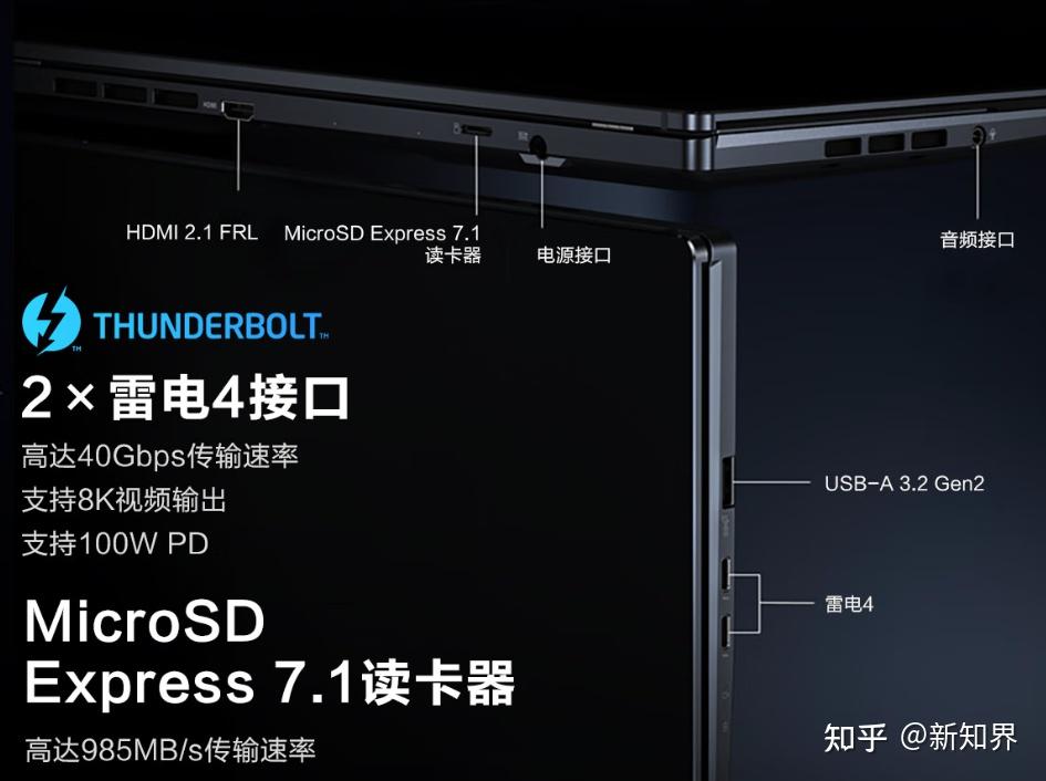 接口方面,配备2个雷电4接口,支持8K视频输出,100瓦PD充电;配备7合一读卡器,传输速度高达985兆每秒;USB 3.2接口1个;HDMI 2.1接口1个;耳麦接口1个。