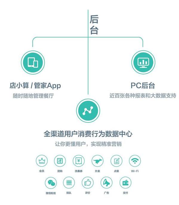 通过收银台记录、收取、整合餐厅用户数据,大到数据分析,小到用户口味,做个体细分差异的营销管理,做全渠道用户消费行为数据中心,实现餐厅对客人的精准营销。