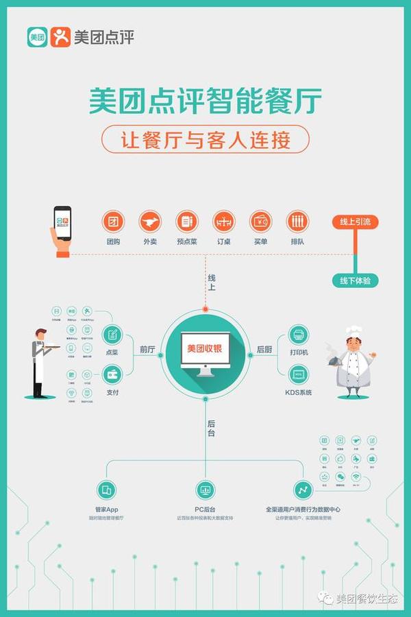 餐厅通过外卖、团购等平台,推广通、用户评价等展示渠道,增加餐厅有效曝光,将客人引流至餐厅;打通排队、预点菜、订桌,买单等系列流程,提升客人就餐体验。