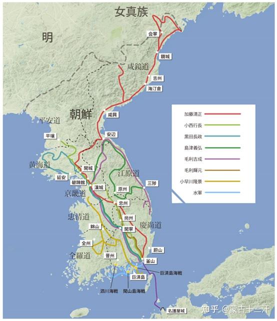 所以秀吉将全军分成九个军团,基本上是一个大名指挥一个。每个军团的人数从一万到三万不等。每个军团都有独立指挥权和行动权,这样秀吉就放心了。但缺陷就是远征军一旦遇到大变故,则不能及时凝聚在一起抵御敌人,这些都在后面战斗中体现。