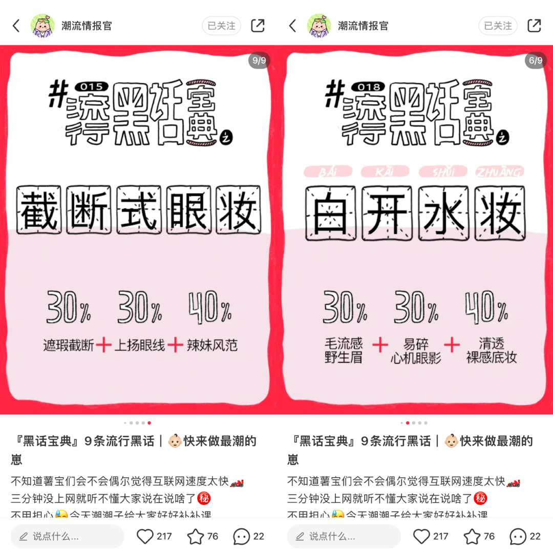 也是因为它直白且有趣的表达,可以让人更加快速、直接地感知、记住产品,“流行黑话“在小红书上不断繁衍。这两年,诸如“早C晚A”、以油养肤、新A醇自由、白开水妆、夏日出逃妆、清冷破碎妆……各类“美妆黑话”层出不穷,也都出自小红书。