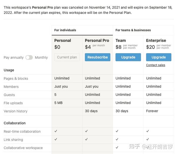 个人免费用户可以享受95%的个人付费功能——最主要区别就是上传空间,免费用户只有5MB(引用网页、在notion里输入都不算,只有上传文件、图片才会占用空间)