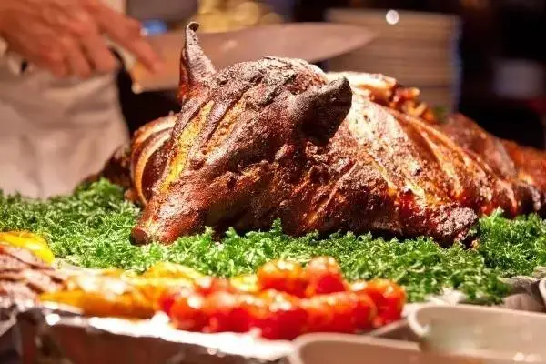 黄亮焦嫩的香猪肉搭配一杯青稞酒。