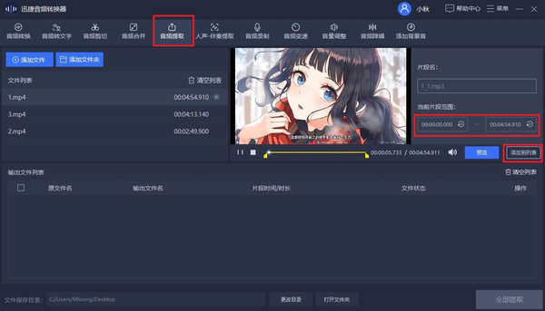 音频提取的可以将视频中的音频提取出来并单独保存,在功能栏点击【音频提取】功能,上传视频文件或者是视频文件夹,然后选中某个视频文件,在最右侧就可以调整片段范围,选好之后点击【添加到列表】,一个视频直接提取整个音频,也可以分成几段音频提取。