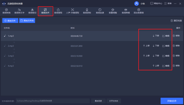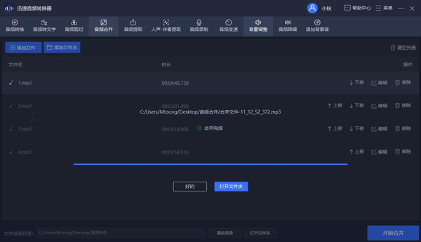调整好之后,点击开始合并就行了,合并完成之后也会自动保存到指定的文件夹中,打开文件夹就可以播放音频了。
