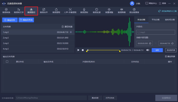 打开迅捷音频转换器,在上面的功能栏点击音频剪切功能,就可以上传音频文件了,可以直接将音频文件拖进去,也可以上传文件夹,里面的音频文件就会自动上传,并且支持多个音频文件批量剪切,还是挺方便的。