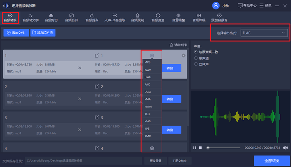 在音频列表的上方可以选择统一的输出格式,在音频列表中可以单独设置这个音频转换为某个格式,选好格式之后点击全部转换就行,转换完成之后会自动保存到指定的文件夹中。