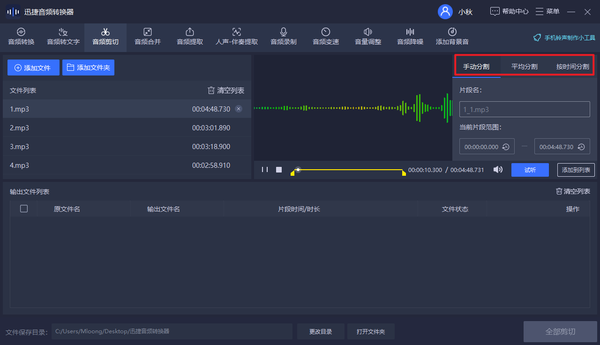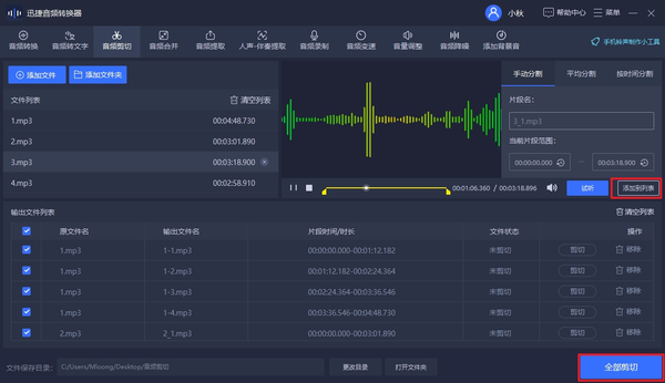 不管是哪种分割模式,将音频分割之后,都需要点击添加到列表,将所有的音频都分割号并添加到列表之后,然后点击全部剪切。