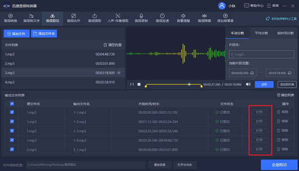 剪切完成之后,会自动保存到指定的文件夹中,点击打开就可以查看剪切好的音频文件。