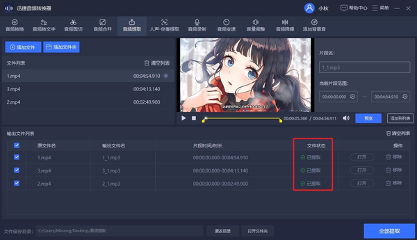 将几个视频中的音频都依次添加到列表之后,然后点击【全部提取】,就可以将音频文件保存到指定的文件夹中了。