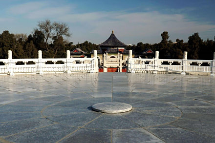 圜丘的上层台面四周环砌九圈台面石,中心圆形石板称“天心石”。其外环砌石板九块,再外一圈为十八块石板,以后依次递增九块,直至“九九”八十一块,寓意“九重天”。人站在天心石上说话,声音特别浑厚、洪亮。