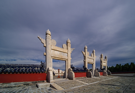 棂星门是古代祭坛壝墙专用门式,形似牌坊,以汉白玉石雕造。天坛圜丘内外墙各设门四组,每组三门,共设棂星门八组24座,称“云门玉立”。