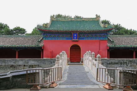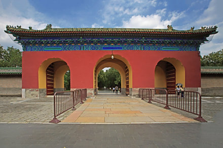 是祈谷坛仪门,坐落于祈年殿南,建于明永乐十八年(1420年)。初称大祀门,后改为大享门。清乾隆十六年(1751年),经乾隆皇帝钦定为祈年门。祈年门为庑殿顶建筑。殿宇五楹,中三间为门,崇基石栏,是中国古代最高等级门制。祈年门中门供皇天上帝专用,皇帝进出左(东)门,百官进出右(西)门。