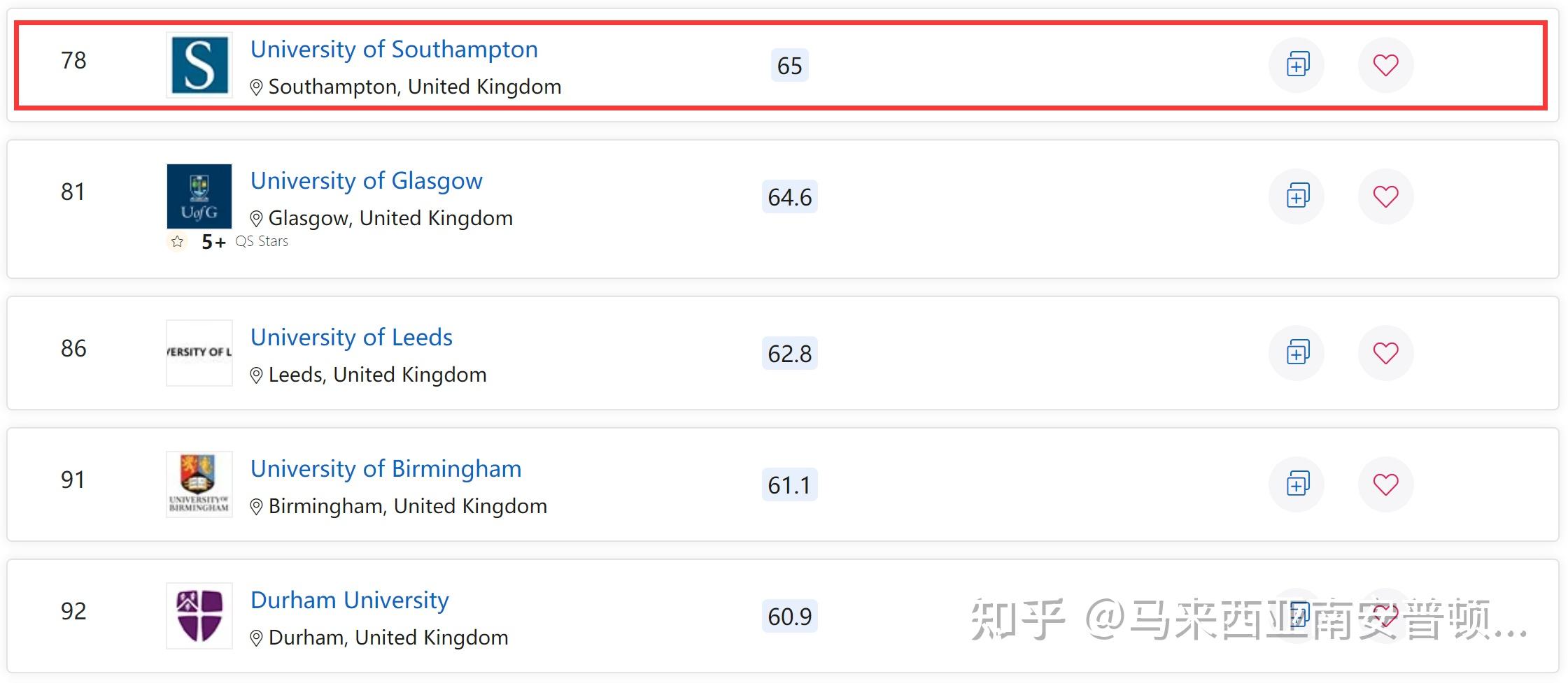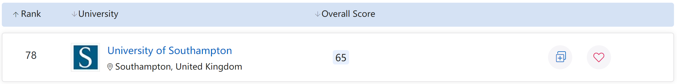 南安普顿大学(University of Southampton)作为 英国皇家授勋大学 , 勋衔Soton ,罗素大学集团成员,世界大学联盟、科学与工程南联盟 、国际大学气候联盟、世界港口城市大学联盟、RENKEI成员等。南安普顿大学今年的世界排名依然表现强势: