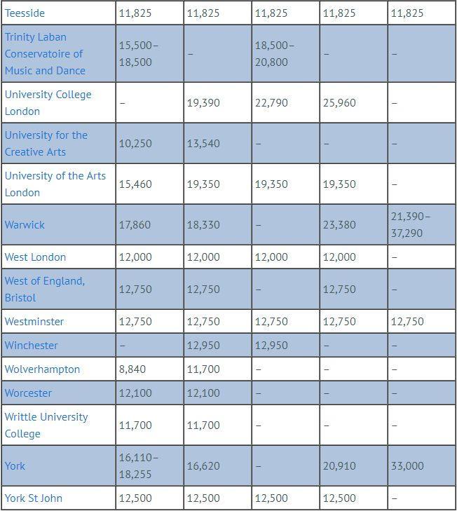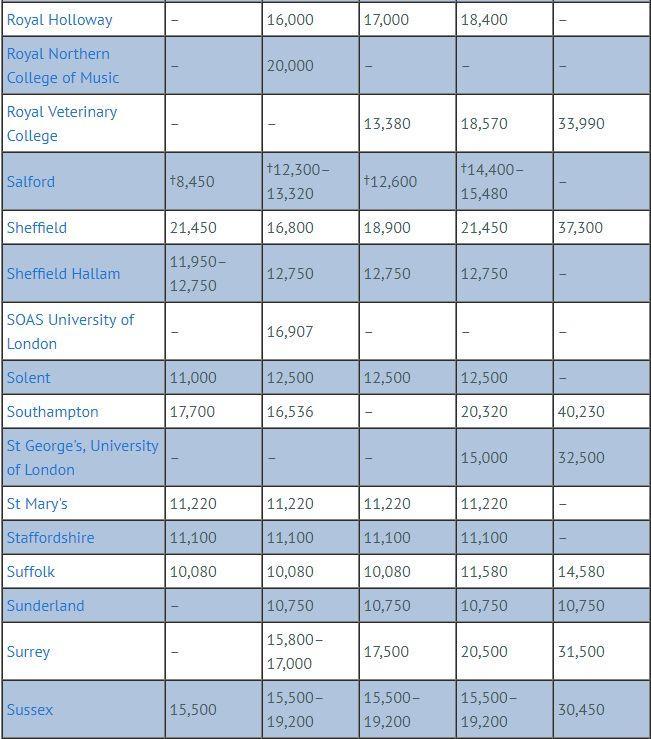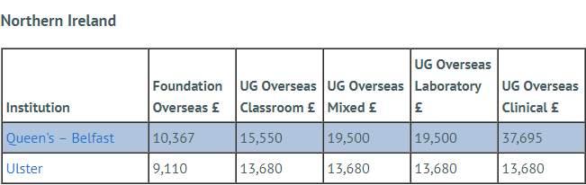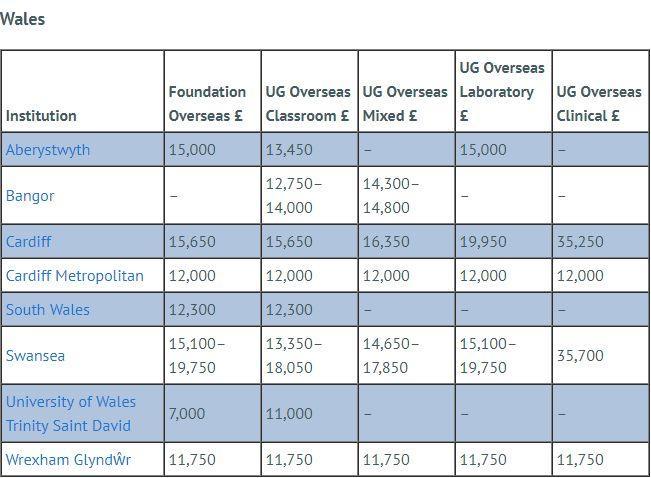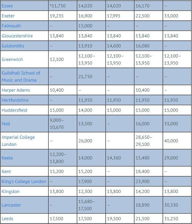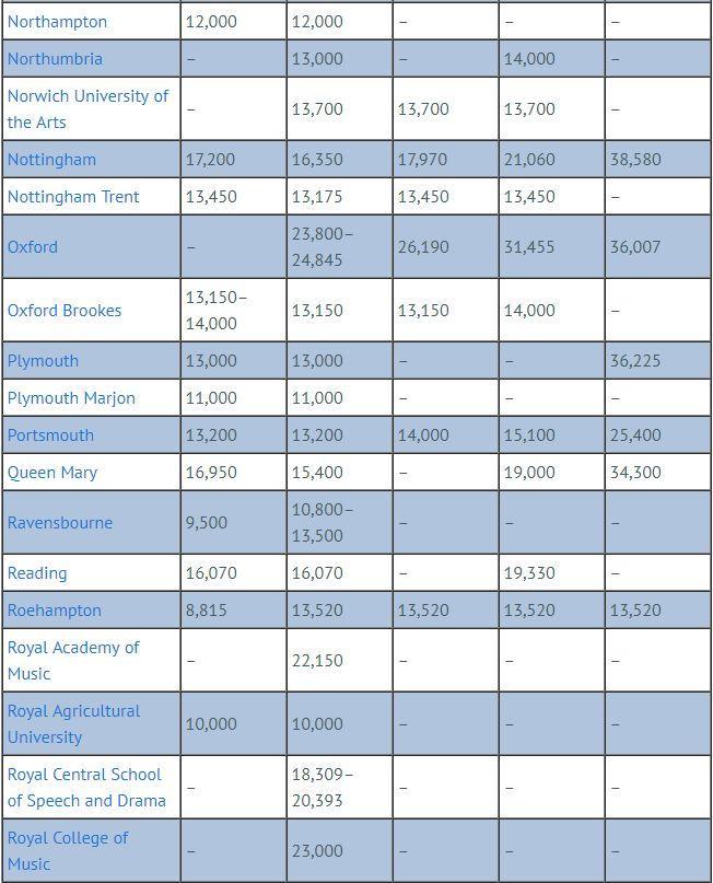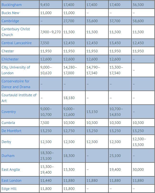 根据《完全大学指南》(The Complete University Guide)统计的“2018-19年度英国大学国际学生学费”结果显示,拥有英国最便宜的国际留学生学费的考文垂大学(Coventry University)收费在9,000–12,600英镑之间。在更负盛名的大学,学费往往会更加高昂,如剑桥大学(University of Cambridge)一年学费至少需要27,700英镑,牛津大学(University of Oxford)一年学费通常在23,800–24,845英镑之间。此外,医学和科学学位尤其是那些涉及昂贵设备或需要进入实验室的学位,将比基于艺术和人文学科的讲授学位更加昂贵。具体数据可看下图: