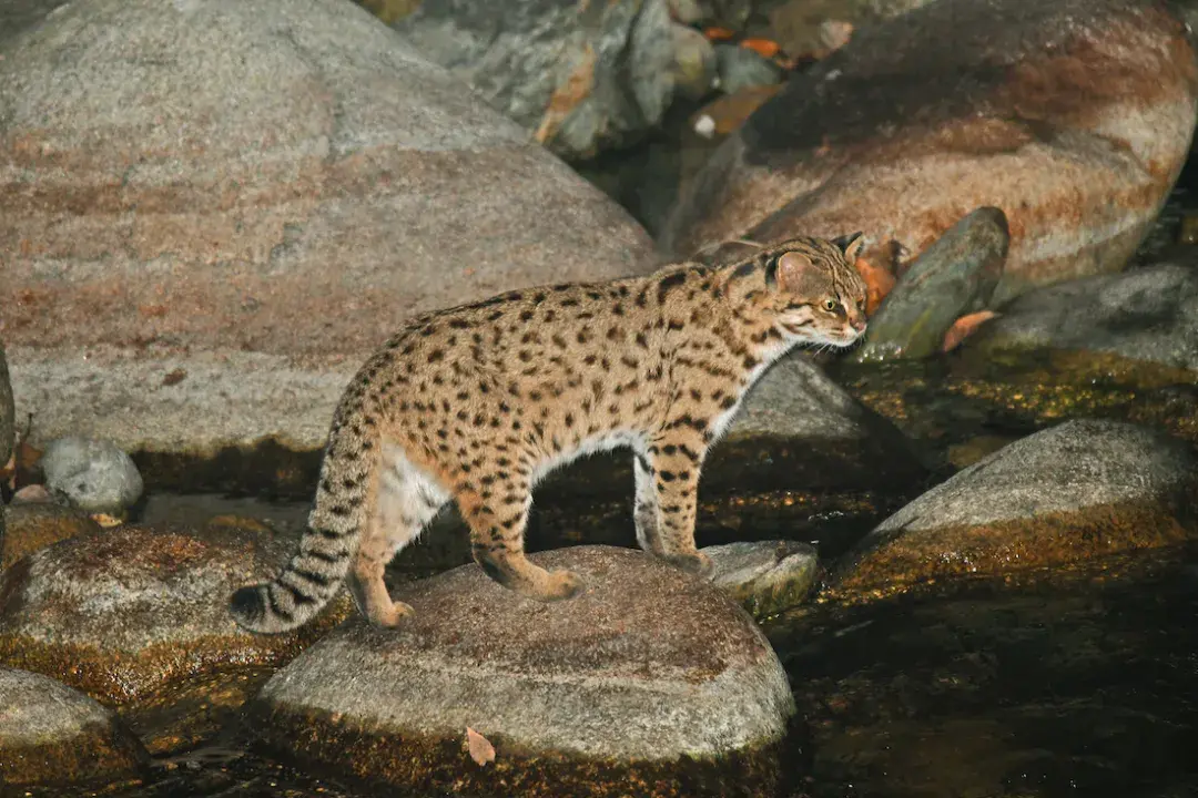 豹猫是典型的夜行动物,主要以小型啮齿类动物为食,这只雄性成年豹猫来到河边也许是为了喝水,也许是在巡视它的领地。