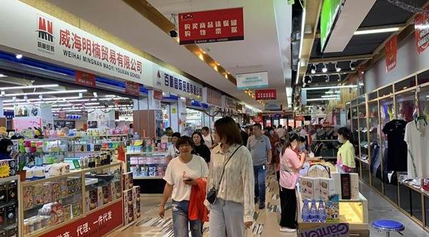 ▲7月19日,来威海韩国商品交易中心购物的游客络绎不绝。