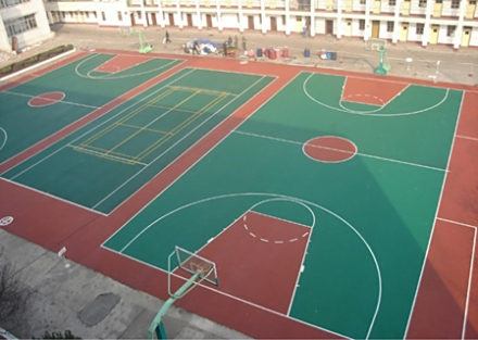 高、耐磨、抗晒、色泽鲜艳、使用寿命长便于管理和维修。这种面层材质稳定的篮球场,球员场上跑动舒服,是一种既可供娱乐打球也可用做正规比赛的高档次篮球场地。