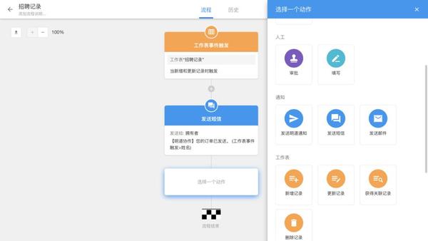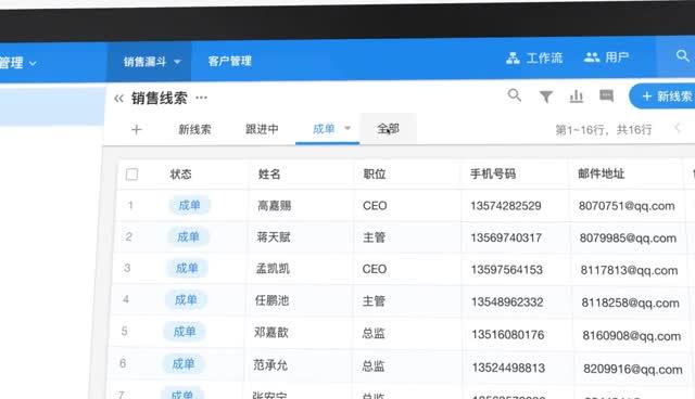 - 工作表的数据可以进行工作流自动化计算。例如,当线索表中的下拉字段改为已成单,就自动生成一个订单。