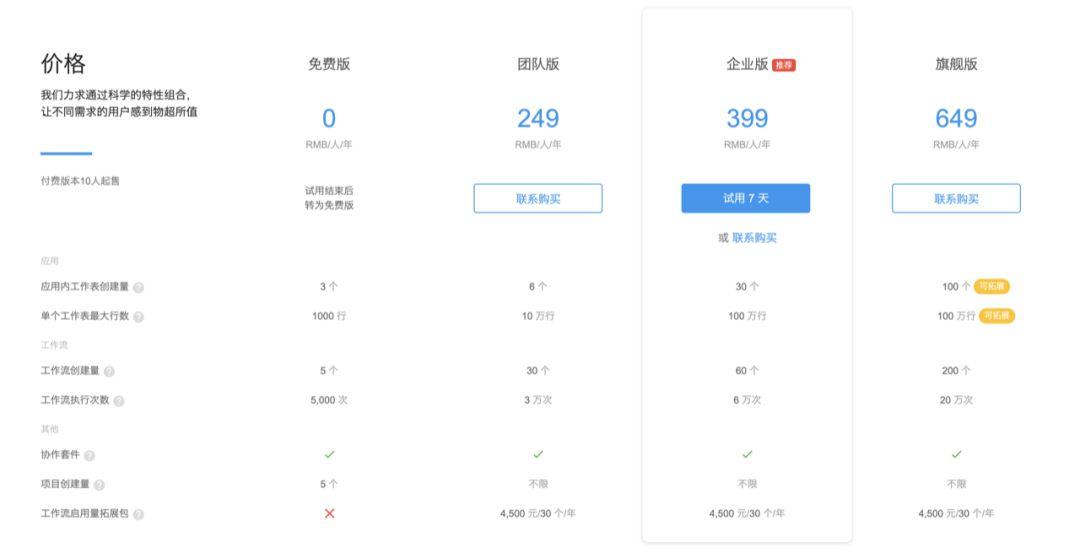 产品发布后,明道云的价格也进行了调整,产品将提供4个版本,分别是:免费版、团队版、企业版、旗舰版,供不同需求的企业选择。定价涵盖的要素包括: