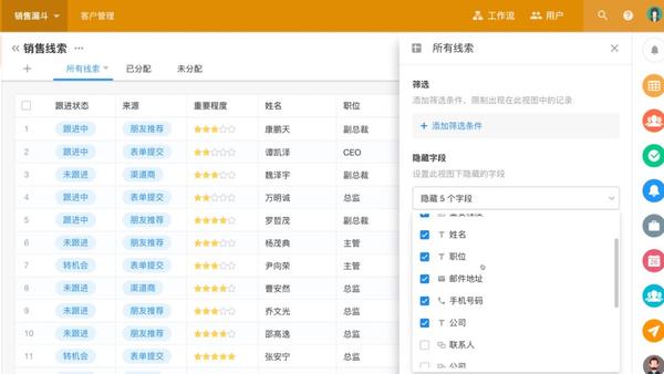 在工作表的基础上,通过数据筛选和字段显隐把不同范畴的数据分发给不同的用户角色。比方说,你可以把销售线索设置为已分配和未分配两个视图,而且这两个视图下的字段显示都不一样。