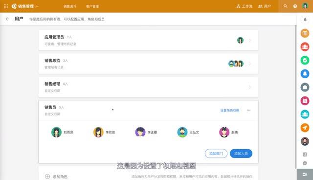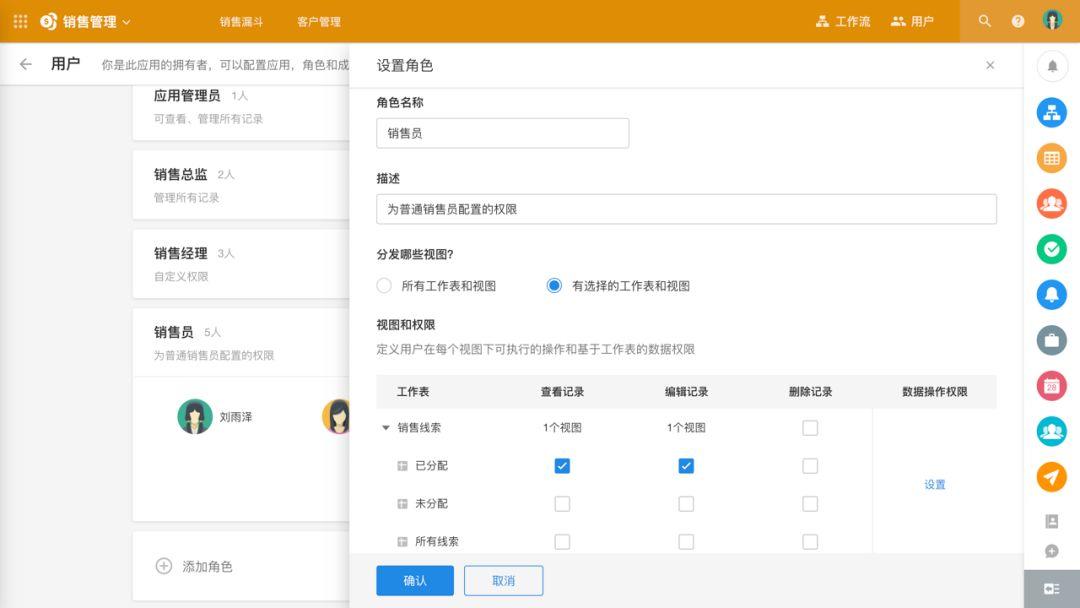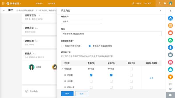 帮助你精细化操作权限,谁能查看,谁能修改,谁能删除,都能自由设定。举例来说,主管可以配置、修改这个应用,而普通员工不可以。