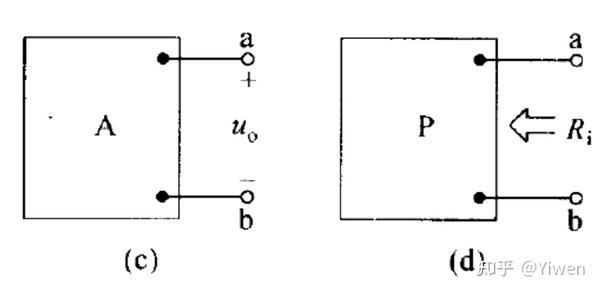 任一由独立电源和线性电阻组成的二端网络对外部的作用与一电压为 u_{0} 的电压源和电阻 R_{i} 串联的电路等效,其中 u_{0} 是该网络两端断开时的电压;电阻 R_{i} 是该网络中的独立电源不作用时,由二端网络的两端点视入的等效电阻(即入端电阻)。