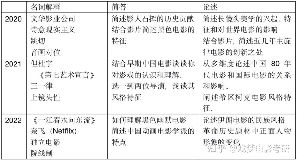 史论难度较低。十个填空内容分布比较广泛,包括基础性的和热点关注,从创作、史论、产业等方面进行摘取。四个名词解释大致按照影人、电影作品、创作专有名词、美学专有名词中选择,并且不会深入,也不会选取偏难怪的名词。22年出现了“奈飞”,意味着未来同样要关注当代、热点中的重要名词。简答题和论述的出题思路比较接近,都是选取史论中的重要流派、风格、国家、阶段等等具体展开分析,但是二者的内容体量不同,需要自己进行答题内容的权衡。