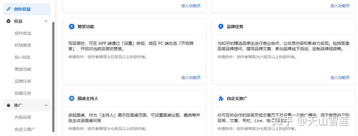 大家可以先登录自己的知乎账号,然后点击右上角头像下面的创作中心,进入创作中心的界面后可以看到在左边有一排功能栏,中间有个叫创作权益,具体可以看下面截图,这是我自己的创作权益界面,