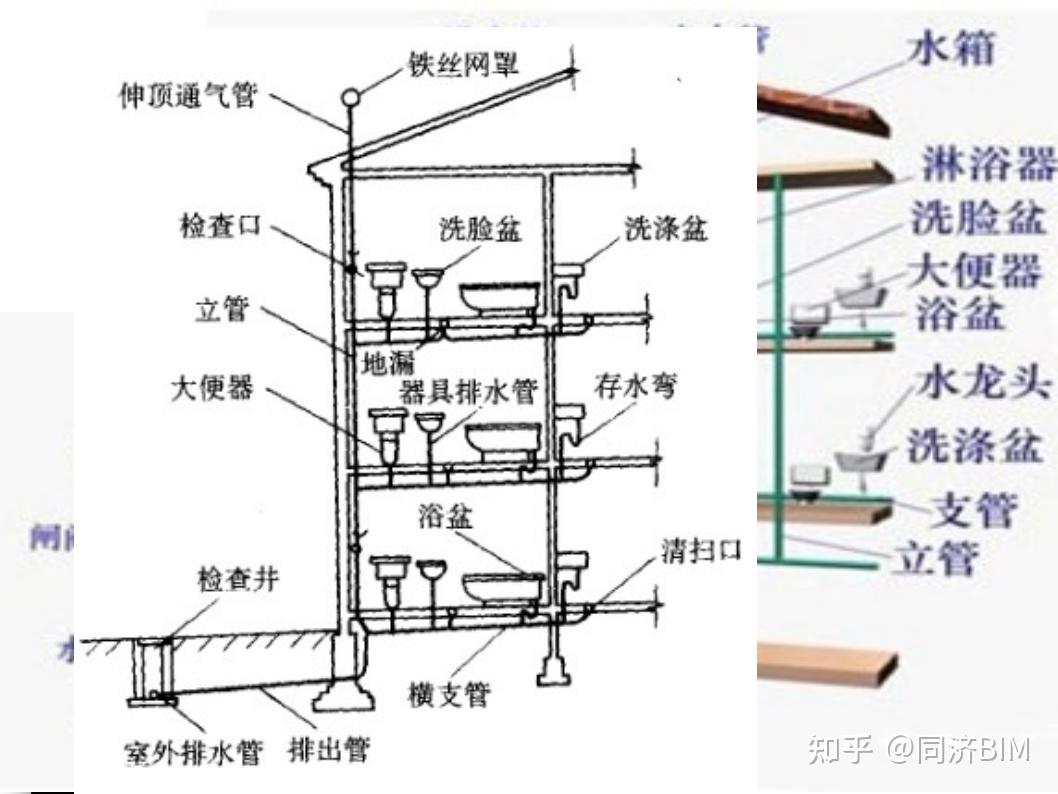 组成:卫生器具排水管(含存水弯)、横支管、立管、埋地干管、出户管(排出管) 。应设水封装置。