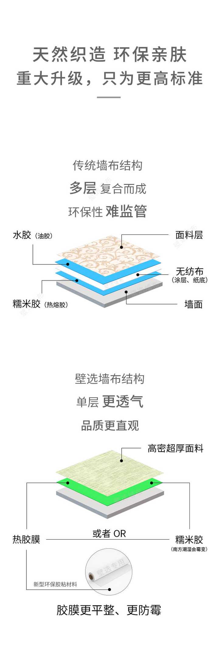 【2017.12.23】 修改部分言语比较偏向的内容。 新增一种新产品介绍,纯布绒底冷热胶(免无纺免复合墙布),工艺上提高纺织密度厚度,接近无纺冷胶厚度,从而不会渗胶溢胶,背部起绒使其上墙更容易贴合,绒底可能是直接纺织而成再拉毛。(对于纺织业没那么深入,所以暂时无法判断) 优势是,1、不需要再复合底直接可上墙,环保性更好。复合无纺底会有一定污染,去复合厂就能闻到一定气味,不过复合过程中除无良厂家用劣质胶外,基本还算比较环保。油胶和水胶的区别,好像是水胶比较环保些。 2、冷胶热胶可做,适应范围地区更广。 当然目前为考虑成本,把布密度厚度增加,采用的纱线会偏粗(涉及精细),偏差一些(染色比例等),总体好过复合无纺底的冷胶。提花立体感,即手感凹凸程度低于最开始的纯布热胶。