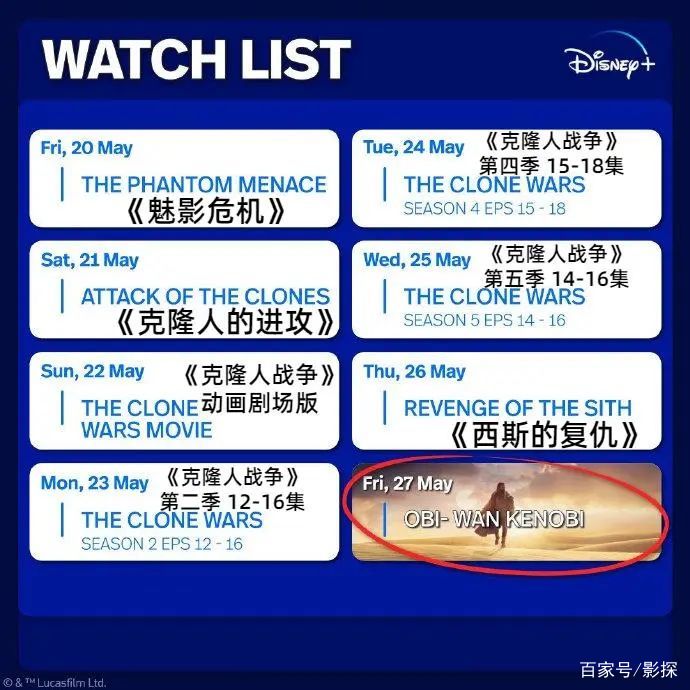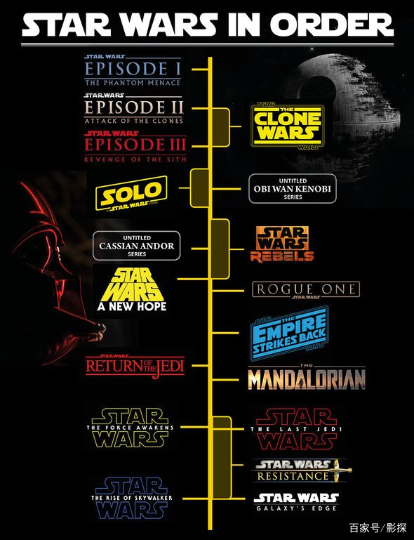 魅影危机—克隆人的进攻—克隆人战争—西斯的复仇—欧比旺—游侠索罗—义军崛起—侠盗一号—新希望—帝国反击战—绝地归来—曼达洛人—曼达洛人2—波巴·菲特之书—抵抗组织—原力觉醒—最后的绝地武士—天行者崛起