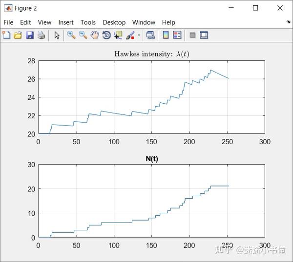 上图对比了Hawkes过程的密度函数和跳跃函数,因为Hawkes过程是基于N(t)跳跃的,所以他们的跳跃点相同。大的不同在于,N(t)是一直向上的,而Hawkes有“低头”的动作,即每次跳跃之后,都有下滑的趋势,然后再经历下一次跳跃。