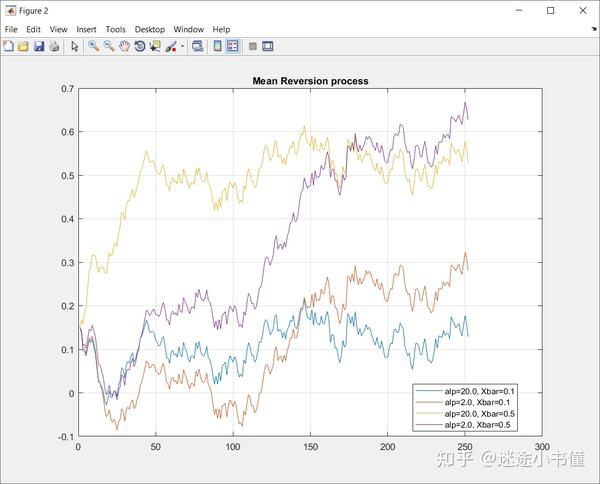 上图中,紫色和黄色的两条线的均值都是0.5,并且黄色的线的强度为20.0,紫色的为2.0;所以可以看到黄色的线的向均值0.5回归的速度更快一些。