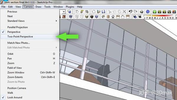 如果您使用的是Sketchup,则可以更改该设置以使垂直元素向上或向下直线移动。只需在用户界面顶部选择“相机”,然后选择“两点透视”。