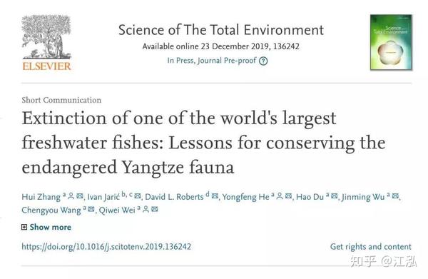 1.Hui Zhang, Hui; Jarić, Ivan; Roberts, David L.; He, Yongfeng; Du, Hao; Wu, Jinming; Wang, Chengyou; Wei, Qiwei; g, Ivan Jarić, David L. Roberts, Yongfeng He, Hao Du, Jinming Wu, Chengyou Wang, Qiwei Wei. Extinction of one of the world's largest freshwater fishes: Lessons for conserving the endangered Yangtze fauna. Science of The Total Environment. 2019-12-23: 136242. ISSN 0048-9697. doi:10.1016/j.scitotenv.2019.136242.