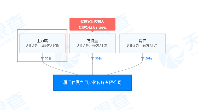 在深扒这家伙的资料时,我们找到了一家名为“厦门仲夏之月文化传媒有限公司”的企业,而王力威持有这家公司50%的股份,而其中还有一个叫方持慧和肖战的人,分别持有这家公司的30%和20%股份,好不夸张地说,这家公司大概率就是肖战和资本之间的关联企业。